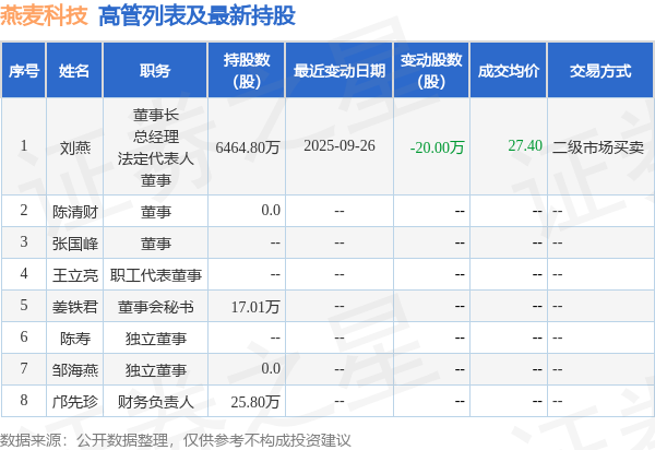 证券之星消息,根据9月26日市场公开信息、上市公司公告及交易所披露数据整理,燕麦科技(688312)最新董监高及相关人员股份变动情况:2025年9月25日公司董事,高级管理人员,核心技术人员刘燕共减持公司股份100.0万股,占公司总股本为0.686%。变动期间公司股价下跌4.2%,9月25日当日收盘报34.25元。
