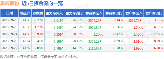 证券之星消息,截至2025年9月26日收盘,恩捷股份(002812)报收于44.35元,下跌2.29%,换手率4.6%,成交量37.21万手,成交额16.72亿元。