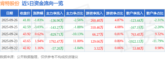 9月26日的资金流向数据方面,主力资金净流出136.96万元,占总成交额2.56%,游资资金净流入260.4万元,占总成交额4.87%,散户资金净流出123.44万元,占总成交额2.31%。