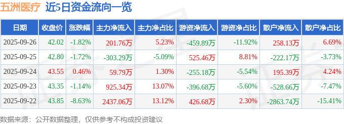 证券之星消息,截至2025年9月26日收盘,五洲医疗(301234)报收于42.02元,下跌1.82%,换手率1.35%,成交量9149.0手,成交额3857.59万元。