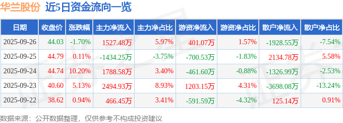 证券之星消息,截至2025年9月26日收盘,华兰股份(301093)报收于44.03元,下跌1.7%,换手率3.67%,成交量5.76万手,成交额2.56亿元。