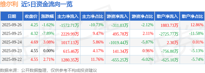 证券之星消息,截至2025年9月26日收盘,维尔利(300190)报收于4.25元,下跌1.62%,换手率4.33%,成交量34.81万手,成交额1.47亿元。