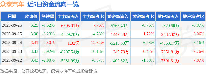 证券之星消息,截至2025年9月26日收盘,众泰汽车(000980)报收于3.25元,下跌1.52%,换手率5.12%,成交量257.78万手,成交额8.53亿元。