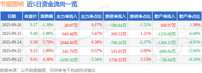 证券之星消息,截至2025年9月26日收盘,节能国祯(300388)报收于9.27元,下跌1.38%,换手率1.94%,成交量13.22万手,成交额1.23亿元。