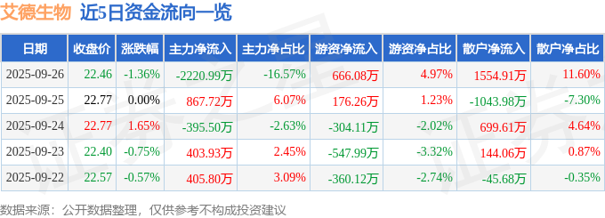 证券之星消息,截至2025年9月26日收盘,艾德生物(300685)报收于22.46元,下跌1.36%,换手率1.53%,成交量5.96万手,成交额1.34亿元。
