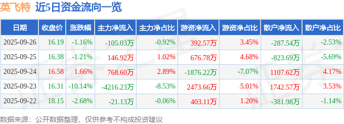 证券之星消息,截至2025年9月26日收盘,英飞特(300582)报收于16.19元,下跌1.16%,换手率3.16%,成交量7.0万手,成交额1.14亿元。
