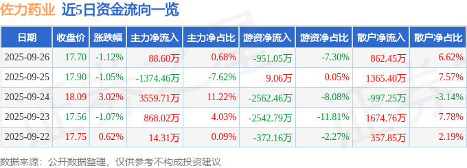 证券之星消息,截至2025年9月26日收盘,佐力药业(300181)报收于17.7元,下跌1.12%,换手率1.22%,成交量7.34万手,成交额1.3亿元。