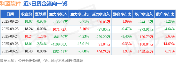 9月26日的资金流向数据方面,主力资金净流出135.91万元,占总成交额0.71%,游资资金净流入380.05万元,占总成交额1.99%,散户资金净流出244.13万元,占总成交额1.28%。
