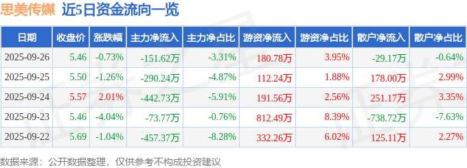 证券之星消息,截至2025年9月26日收盘,思美传媒(002712)报收于5.46元,下跌0.73%,换手率1.54%,成交量8.35万手,成交额4574.01万元。