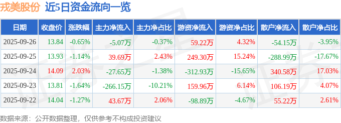 9月26日的资金流向数据方面,主力资金净流出5.07万元,占总成交额0.37%,游资资金净流入59.22万元,占总成交额4.32%,散户资金净流出54.15万元,占总成交额3.95%。