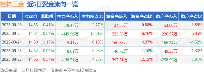 证券之星消息,截至2025年9月26日收盘,桂林三金(002275)报收于14.55元,下跌0.41%,换手率0.35%,成交量1.95万手,成交额2834.27万元。