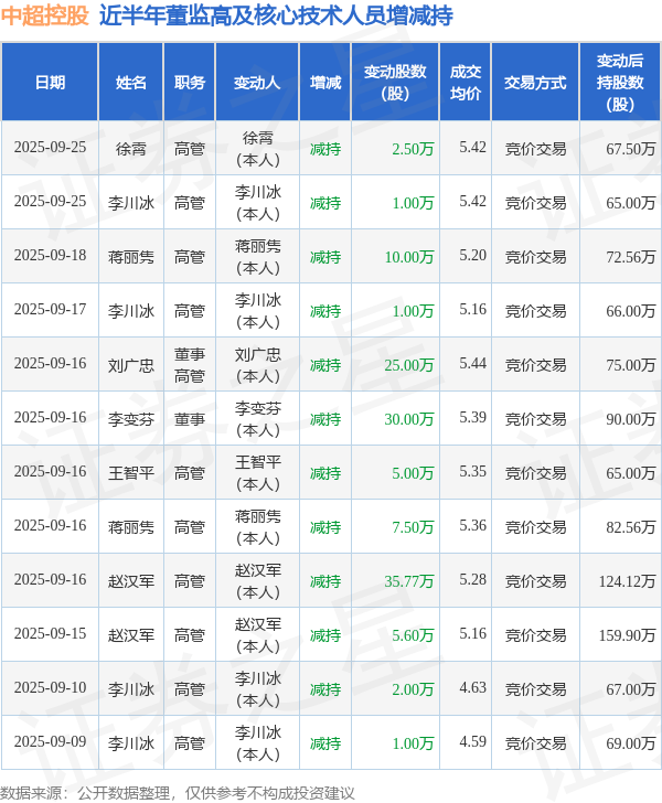 中超控股近半年内的董监高及核心技术人员增减持详情如下: