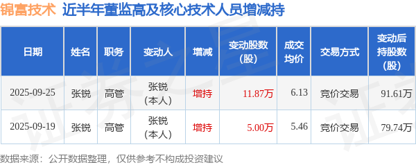 锦富技术近半年内的董监高及核心技术人员增减持详情如下: