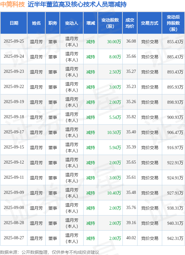 中简科技近半年内的董监高及核心技术人员增减持详情如下: