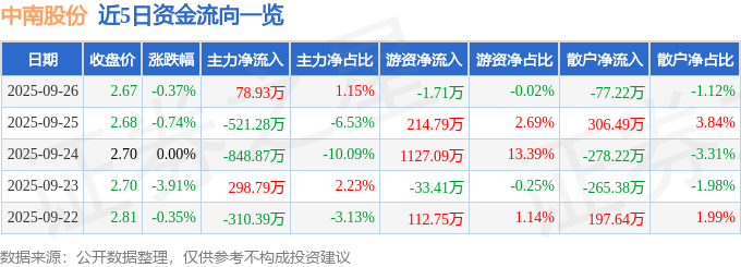 证券之星消息,截至2025年9月26日收盘,中南股份(000717)报收于2.67元,下跌0.37%,换手率1.06%,成交量25.61万手,成交额6874.37万元。