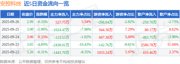 证券之星消息,截至2025年9月26日收盘,安控科技(300370)报收于2.99元,下跌0.33%,换手率2.39%,成交量31.68万手,成交额9517.72万元。