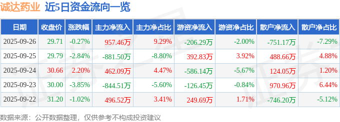 证券之星消息,截至2025年9月26日收盘,诚达药业(301201)报收于29.71元,下跌0.27%,换手率3.2%,成交量3.48万手,成交额1.03亿元。