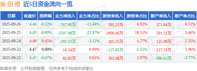 证券之星消息,截至2025年9月26日收盘,盐 田 港(000088)报收于4.44元,下跌0.22%,换手率0.41%,成交量12.86万手,成交额5709.43万元。