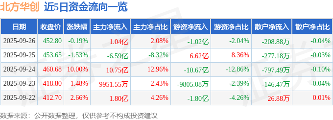 证券之星消息,截至2025年9月26日收盘,北方华创(002371)报收于452.8元,下跌0.19%,换手率1.51%,成交量10.95万手,成交额49.86亿元。