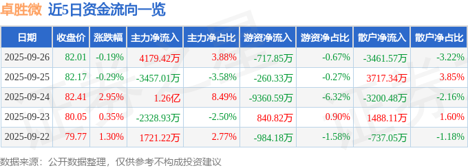 证券之星消息,截至2025年9月26日收盘,卓胜微(300782)报收于82.01元,下跌0.19%,换手率2.89%,成交量12.95万手,成交额10.77亿元。