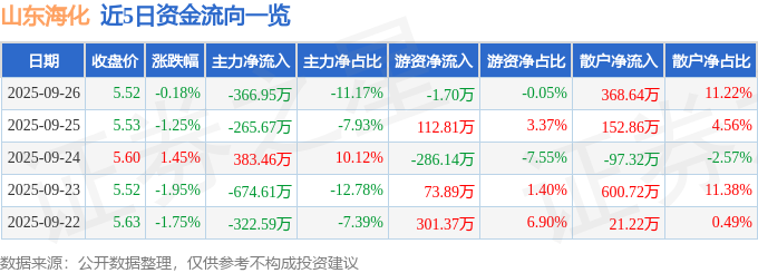 证券之星消息,截至2025年9月26日收盘,山东海化(000822)报收于5.52元,下跌0.18%,换手率0.66%,成交量5.94万手,成交额3285.94万元。