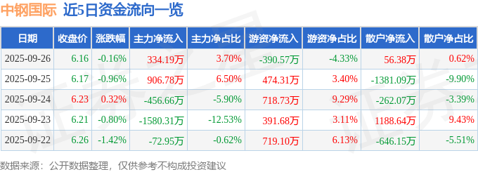 证券之星消息,截至2025年9月26日收盘,中钢国际(000928)报收于6.16元,下跌0.16%,换手率1.02%,成交量14.64万手,成交额9022.17万元。