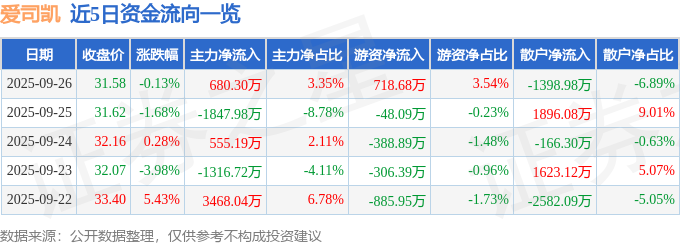 证券之星消息,截至2025年9月26日收盘,爱司凯(300521)报收于31.58元,下跌0.13%,换手率4.24%,成交量6.32万手,成交额2.03亿元。