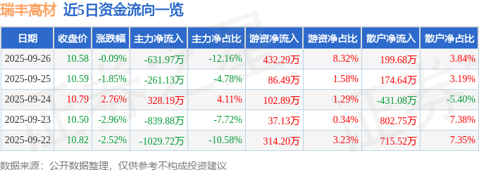 9月26日的资金流向数据方面,主力资金净流出631.97万元,占总成交额12.16%,游资资金净流入432.29万元,占总成交额8.32%,散户资金净流入199.68万元,占总成交额3.84%。
