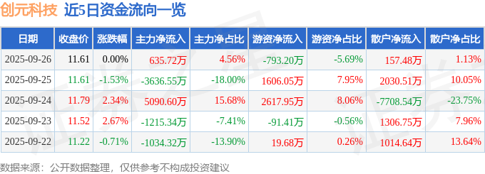 证券之星消息,截至2025年9月26日收盘,创元科技(000551)报收于11.61元,上涨0.0%,换手率2.46%,成交量11.9万手,成交额1.39亿元。