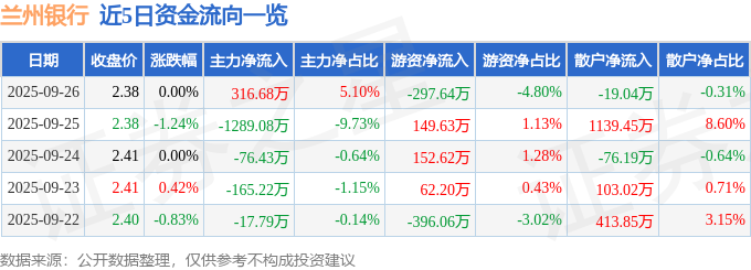 证券之星消息,截至2025年9月26日收盘,兰州银行(001227)报收于2.38元,上涨0.0%,换手率0.62%,成交量26.09万手,成交额6204.4万元。