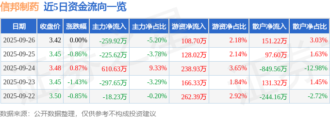 证券之星消息,截至2025年9月26日收盘,信邦制药(002390)报收于3.42元,上涨0.0%,换手率0.76%,成交量14.6万手,成交额4995.41万元。