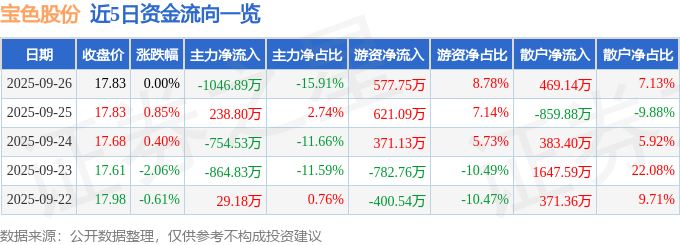 9月26日的资金流向数据方面,主力资金净流出1046.89万元,占总成交额15.91%,游资资金净流入577.75万元,占总成交额8.78%,散户资金净流入469.14万元,占总成交额7.13%。