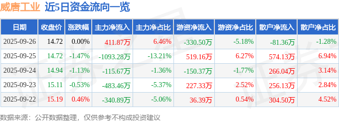 证券之星消息,截至2025年9月26日收盘,威唐工业(300707)报收于14.72元,上涨0.0%,换手率3.0%,成交量4.3万手,成交额6379.51万元。
