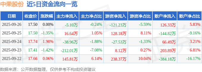 证券之星消息,截至2025年9月26日收盘,中荣股份(301223)报收于17.5元,上涨0.0%,换手率1.1%,成交量1.23万手,成交额2168.48万元。