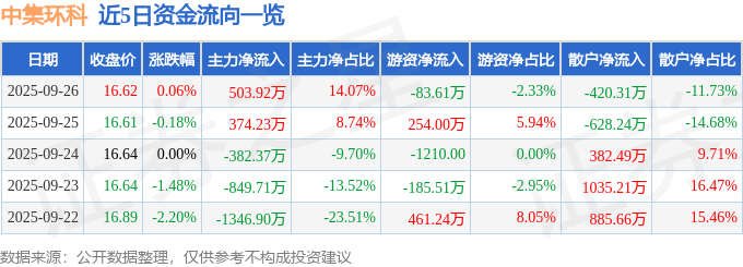 9月26日的资金流向数据方面,主力资金净流入503.92万元,占总成交额14.07%,游资资金净流出83.61万元,占总成交额2.33%,散户资金净流出420.31万元,占总成交额11.73%。
