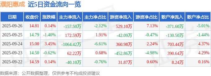 证券之星消息,截至2025年9月26日收盘,濮阳惠成(300481)报收于14.81元,上涨0.14%,换手率1.72%,成交量4.99万手,成交额7419.0万元。