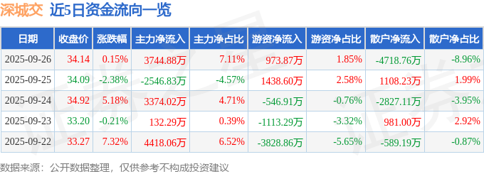 证券之星消息,截至2025年9月26日收盘,深城交(301091)报收于34.14元,上涨0.15%,换手率2.89%,成交量15.23万手,成交额5.27亿元。