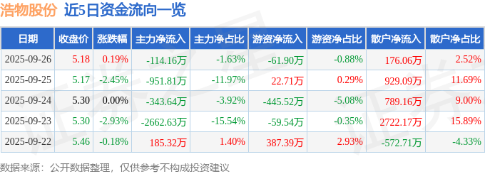 9月26日的资金流向数据方面,主力资金净流出114.16万元,占总成交额1.63%,游资资金净流出61.9万元,占总成交额0.88%,散户资金净流入176.06万元,占总成交额2.52%。