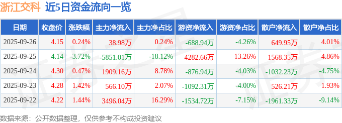 证券之星消息,截至2025年9月26日收盘,浙江交科(002061)报收于4.15元,上涨0.24%,换手率1.5%,成交量38.98万手,成交额1.62亿元。