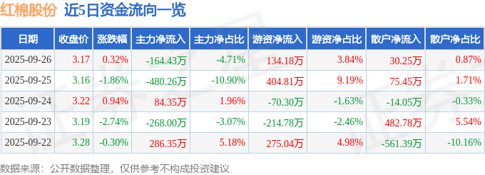 证券之星消息,截至2025年9月26日收盘,红棉股份(000523)报收于3.17元,上涨0.32%,换手率0.83%,成交量11.02万手,成交额3493.09万元。
