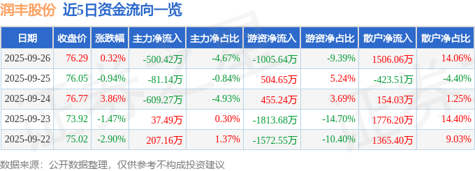 证券之星消息,截至2025年9月26日收盘,润丰股份(301035)报收于76.29元,上涨0.32%,换手率0.5%,成交量1.4万手,成交额1.07亿元。
