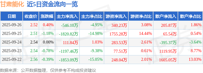 证券之星消息,截至2025年9月26日收盘,甘肃能化(000552)报收于2.52元,上涨0.4%,换手率1.17%,成交量43.66万手,成交额1.1亿元。