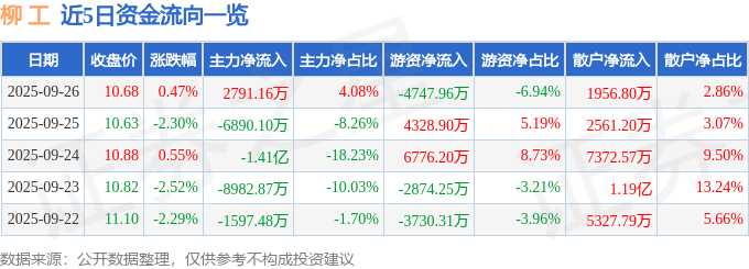 证券之星消息,截至2025年9月26日收盘,柳 工(000528)报收于10.68元,上涨0.47%,换手率3.13%,成交量63.5万手,成交额6.84亿元。