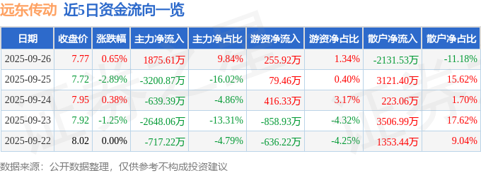 证券之星消息,截至2025年9月26日收盘,远东传动(002406)报收于7.77元,上涨0.65%,换手率4.05%,成交量24.38万手,成交额1.91亿元。