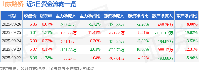 证券之星消息,截至2025年9月26日收盘,山东路桥(000498)报收于6.05元,上涨0.67%,换手率0.65%,成交量9.49万手,成交额5727.05万元。