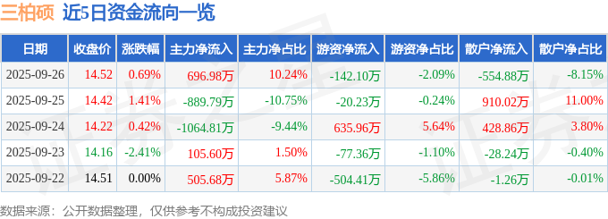 证券之星消息,截至2025年9月26日收盘,三柏硕(001300)报收于14.52元,上涨0.69%,换手率7.14%,成交量4.73万手,成交额6808.68万元。