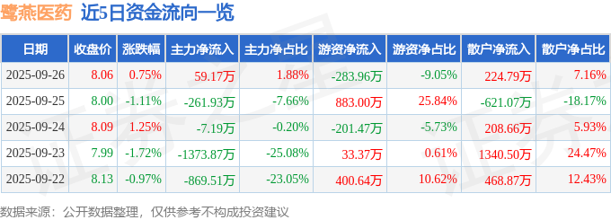证券之星消息,截至2025年9月26日收盘,鹭燕医药(002788)报收于8.06元,上涨0.75%,换手率1.02%,成交量3.9万手,成交额3139.32万元。