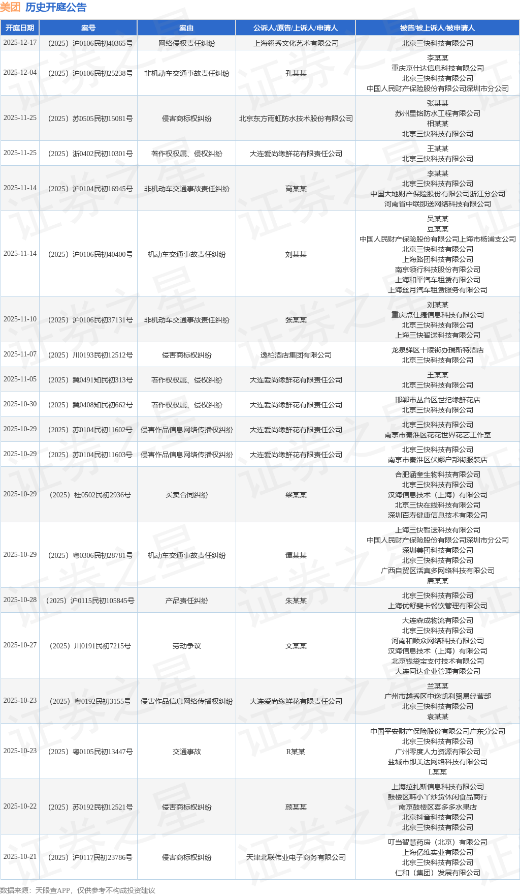 案号:(2025)粤1202民初6419号根据统计,近一年内以北京三快科技有限公司为当事人的历史开庭公告有725则,其中案由为“非机动车交通事故责任纠纷”的公告以173则居首,其次为“侵害商标权纠纷”有165则,“机动车交通事故责任纠纷”有99则。历史开庭公告(前20条)如下: