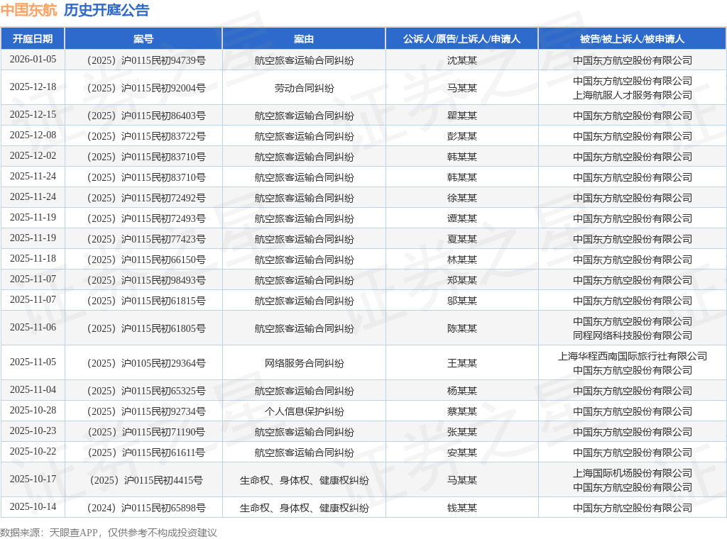 案号:(2025)沪0115民初77717号根据统计,近一年内以中国东方航空股份有限公司为当事人的历史开庭公告有163则,其中案由为“航空旅客运输合同纠纷”的公告以111则居首,其次为“生命权、身体权、健康权纠纷”有9则,“劳动合同纠纷”有6则。历史开庭公告(前20条)如下: