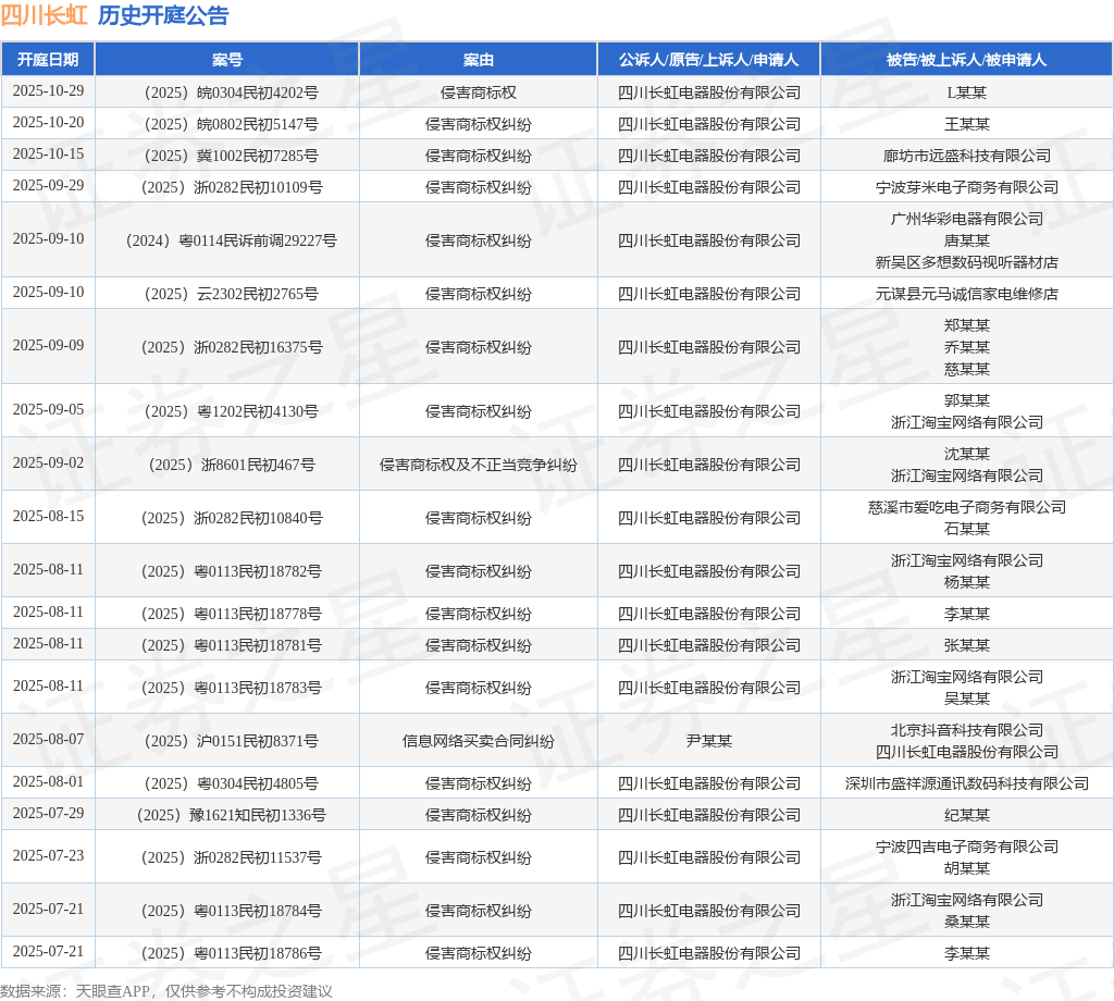 案号:(2025)浙0282民初10109号根据统计,近一年内以四川长虹电器股份有限公司为当事人的历史开庭公告有90则,其中案由为“侵害商标权纠纷”的公告以59则居首,其次为“劳动争议”有12则,“劳动合同纠纷”有4则。历史开庭公告(前20条)如下: